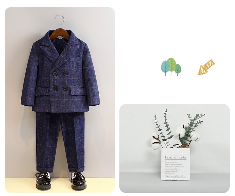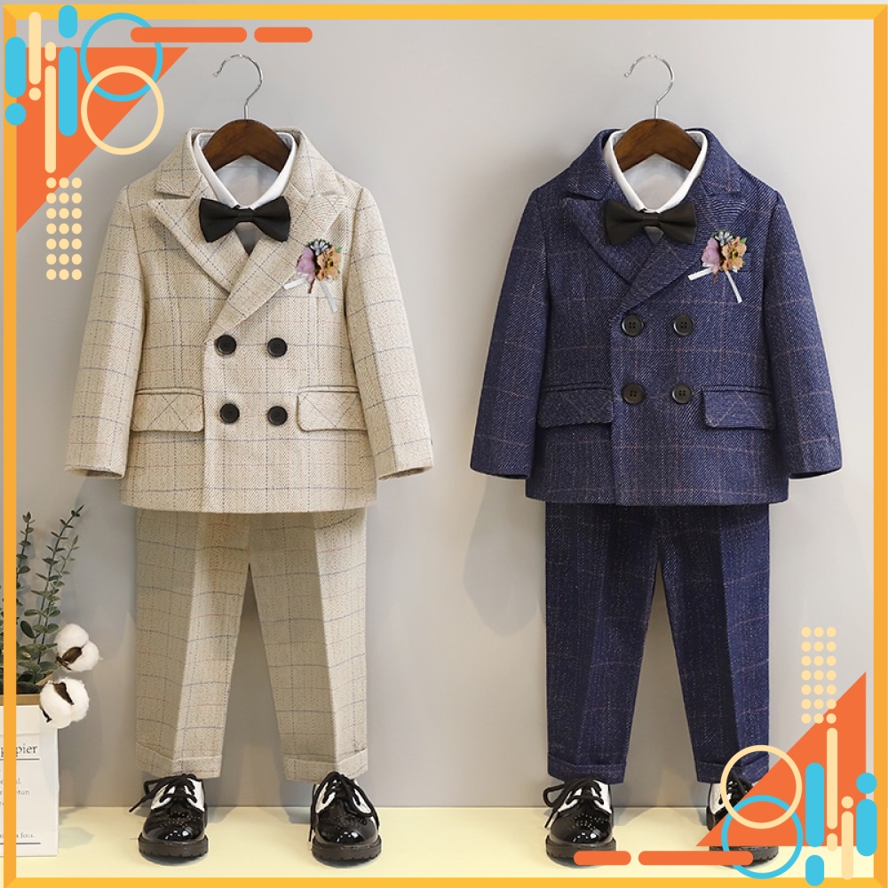 Bộ gồm 4 chi tiết: 1 áo vest + 1 Quần tây + 1 nơ + 1 hoa (Không bao gồm áo Sơ mi)